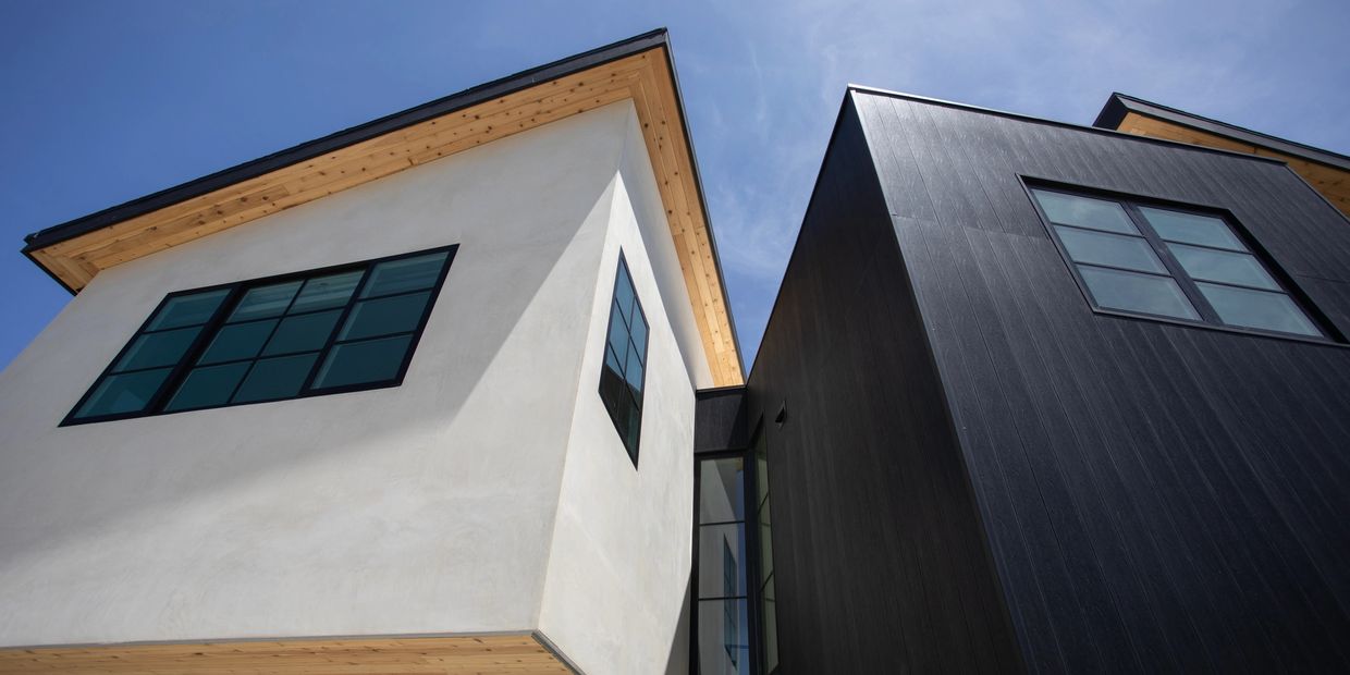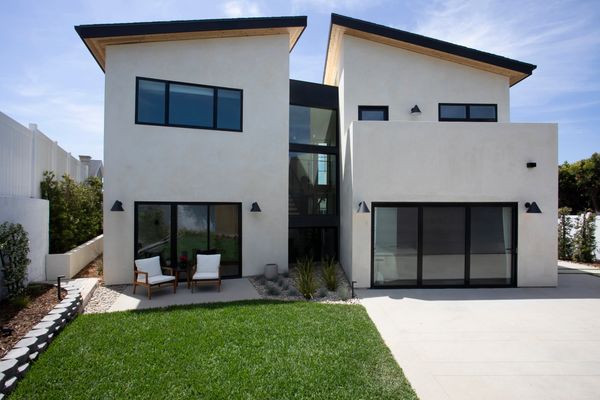 Designed as a 4-bedroom, 3-bathroom plus Office, the first floor features an open Kitchen, Dining, Living plan with multi-fold doors out to the rear yard, a guest bedroom, and an office/extra bedroom. The stairway is set against a glass wall which allows it to float in the space, connecting both volumes and floor levels. At the second story there are two bedrooms, a bathroom, a laundry room, and a primary suite with a private balcony.